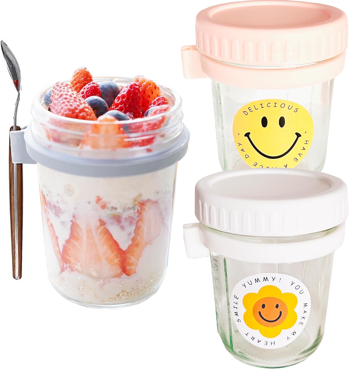 Overnight Oat Container Set with Lid: The package includes 2 packs of 16 ounce pink and white overnight oatmeal cans and 2 stainless steel spoons, and includes a smiling face sticker, making it ideal for daily kitchen use. Overnight oatmeal cans with lid, such as oats, yogurt, pudding, salads, etc., are perfect for DIY your own overnight oats.